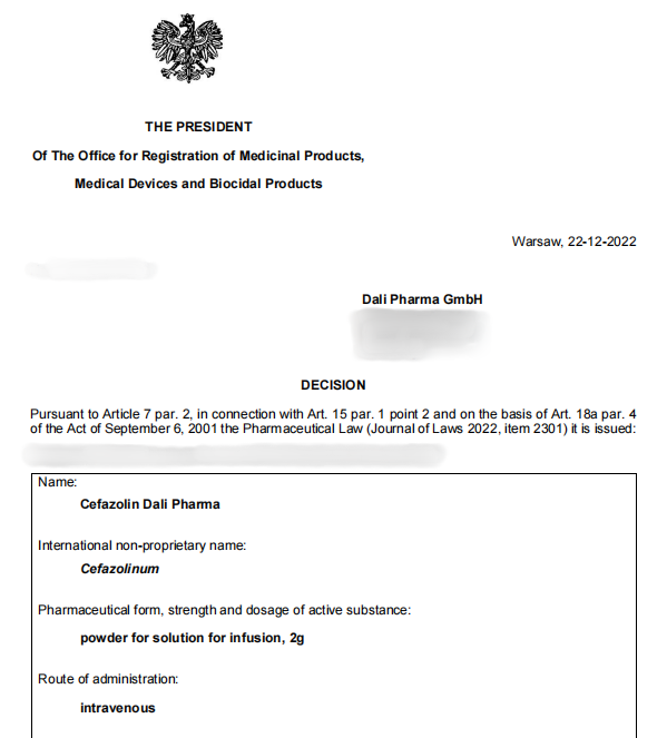近日,国药凯时网站控股公司DALI Pharma GmbH(以下简称“DALI Pharma”)收到波兰药监局药品注册办公室核准签发的注射用头孢唑林钠(1g、2g)的上市许可。
